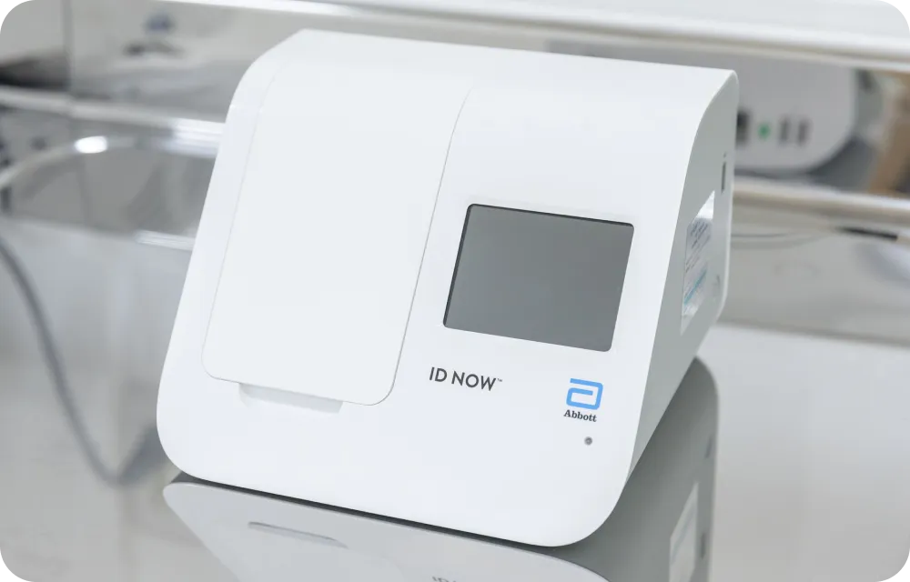 この度、 ウイルスPCR検査機器(ID NOW™)を導入しました。ウイルスPCR検査は、一般的な迅速検査(ウイルス抗原検査)と比較して診断精度が向上します。新型コロナ、インフルエンザ、溶連菌の検査が可能です。特に発症早期の新型コロナ、インフルエンザの診断に有用です。